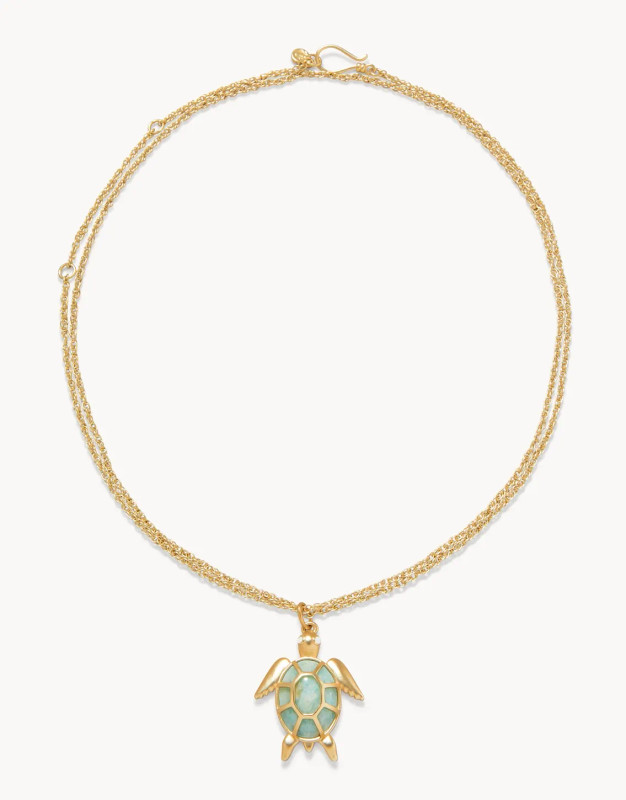 This Green Sea Turtle Necklace holds all the coastal charm in its 18 KT matte gold plating and natural Amazonite stone. Wear this necklace to keep the ocean and all its magical creatures close to heart. Can be worn long or double up chain for a shorter style.