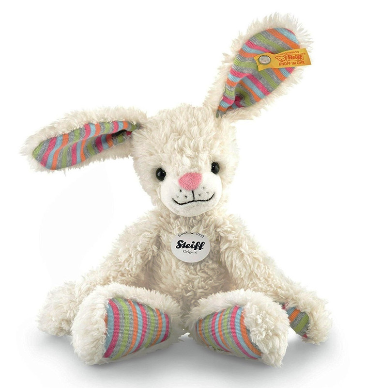 Happy Bunny from Steiff Germany has floppy arms and legs and is fun to carry around. She is so happy with her bright striped fabric in her ears and on her paws.