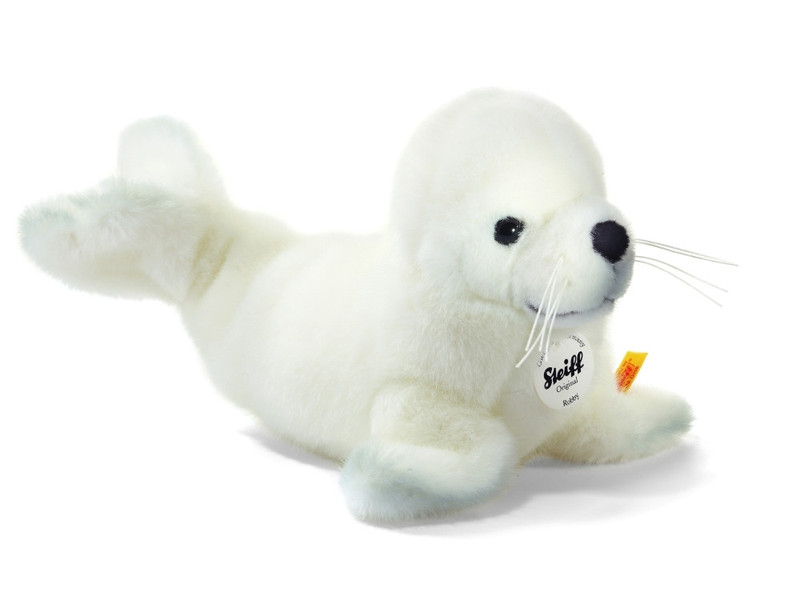This soft plush Robbie white seal from Steiff Germany has big eyes and a sweet face.