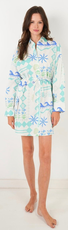 This comfy cotton shirt dress from Stitchdrop is in a aqua and blue windward print with flowers, the sun, seashells, and waves. Just the right style for an everyday resort outing.