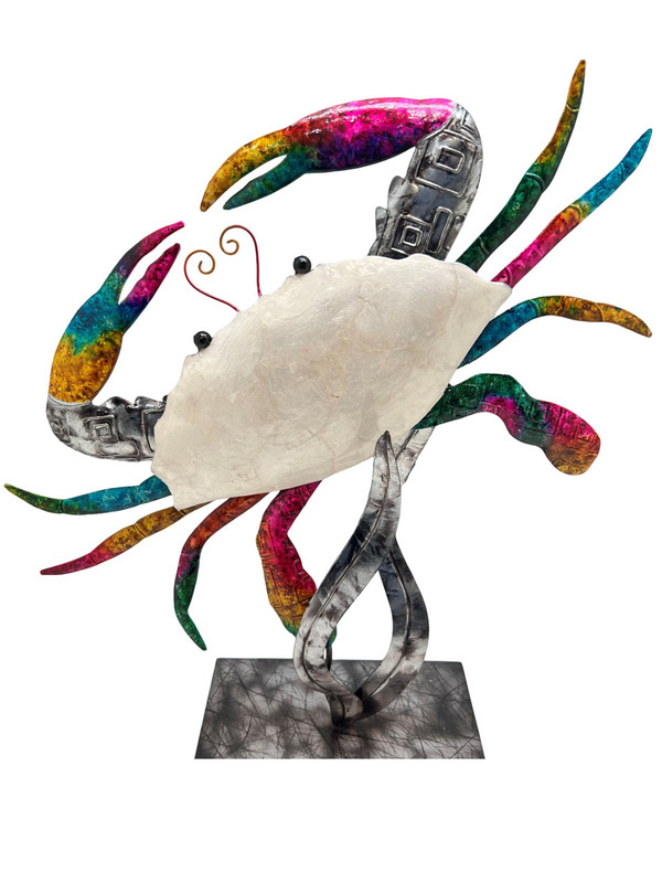 Handcrafted cut metal and capiz shells of a colorful splash of colors this crab is among the sea weeds mounted on a metal block stand. Decorate your beach house with beach decor.