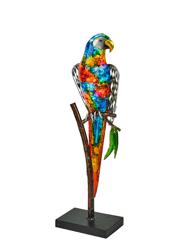 Handcrafted cut metal in a splash of brilliant colors is a stunning detailed Amazon Parrot bird on a tree branch. Decorate your beach house with tropical decor.