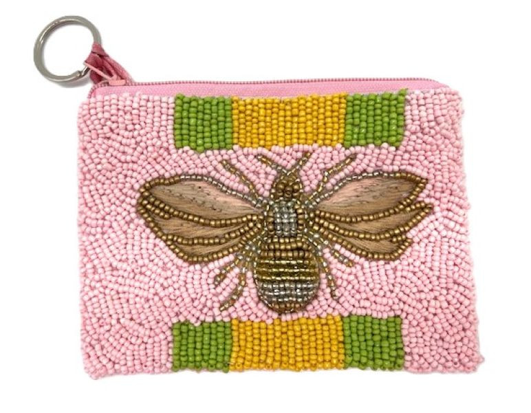 This special beaded coin purse in a bumble bee theme is handmade by Tiana Designs. It has an attached key ring and holds a little something inside.