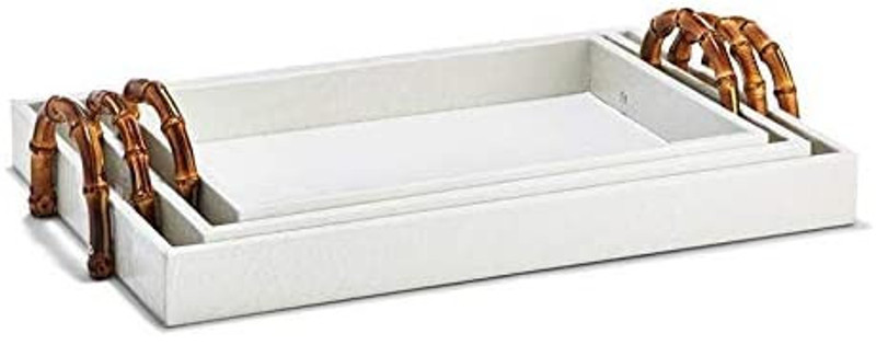 This serving tray set from Tozai Home is all about quality and style. The texture is a crocodile embossed leather over wood with large bamboo handles for easy carrying.