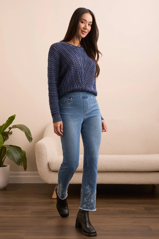 Step up your denim game in these pull-on jeans designed with a mid-rise fit and slim leg for a streamlined look. Crafted from textured stretch denim, they feature a 28'' inseam, decorative front pockets, and a frayed, embroidered hem that brings standout style to everyday dressing. Five functional pockets