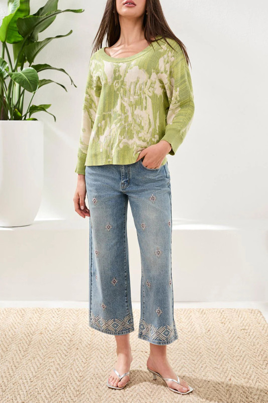 An attractive lemongrass Tribal jacquard knit sweater with U-shaped neckline. Easy relaxed fit. Perfect year round piece. Great with jeans, pants or skirts!