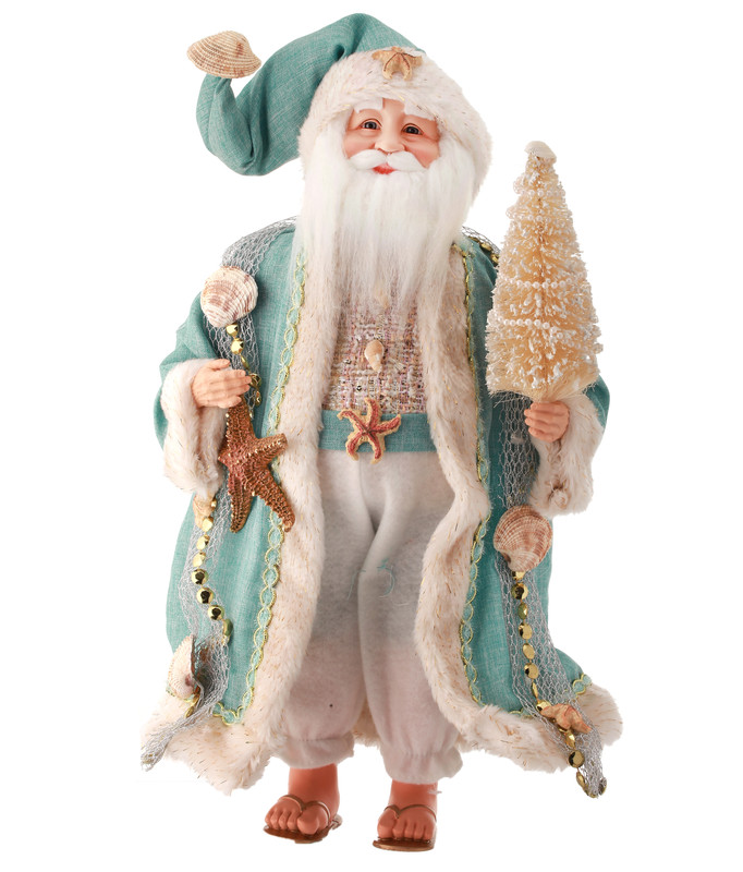 This Santa looks like he is right from under the sea, sea shells, starfish, and fish nets attached to his outfit. He wears flip flops and carries a ivory Christmas Tree.