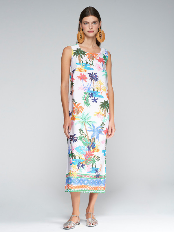 This high fashion Vilagallo long midi dress in a colorful palm tree print designed by the Vilagallo team is sure to keep you cool and looking fantastic at your next resort. Just slip on and go!